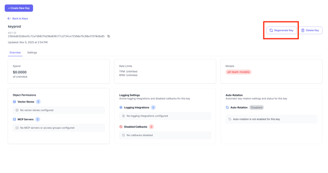 On the LiteLLM Proxy UI, go to Virtual Keys > Click on a key > Click "Regenerate Key"