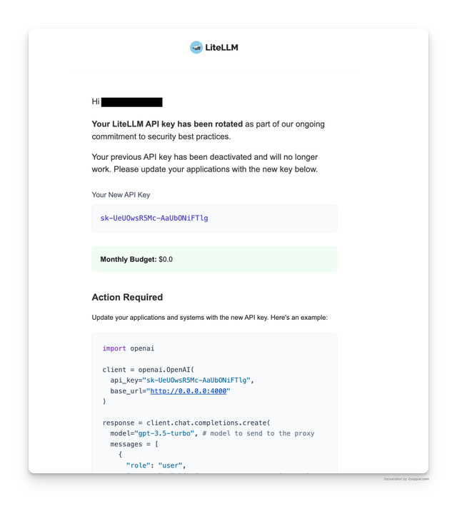 This email is sent when you rotate an API key for a user on LiteLLM Proxy.