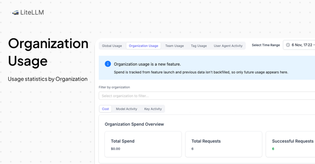 - Filter usage analytics, spend logs, and activity metrics by organization ID
